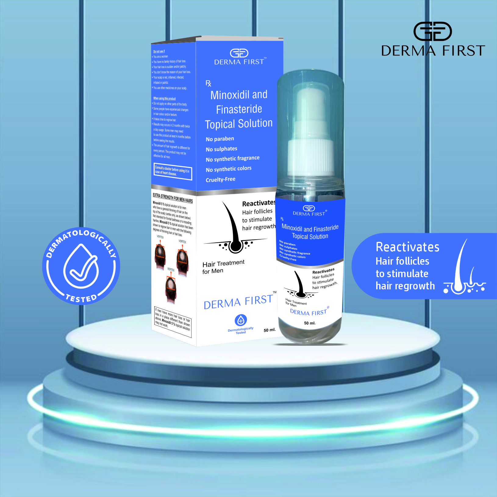Derma First Minoxidil & Finasteride Topical Solution is an advanced hair regrowth treatment designed specifically for men experiencing hair thinning, receding hairlines, and pattern baldness. This powerful formula combines Minoxidil and Finasteride, two clinically proven ingredients that work together to reactivate hair follicles, stimulate hair growth, and prevent further hair loss.